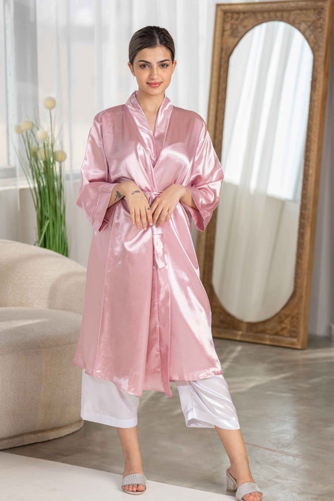 روب عرائس وردي سادة عبارة عن قطعة فاخرة وفريدة يتميز روب العرائس بقماشة الحرير الناعم الذي يضفي لمسة ولمعة من الأناقة على مظهر العروس يتميز الروب بقصة رائعة مع تدخيلات قماش التل من الأسفل والكم مع اضافة تطريز حسب الطلب يعطي الروب للعروس اطلالة رائعة وناعمة مما يجعل العروس تبدوا وكأنها ساحرة في يوم زفافه