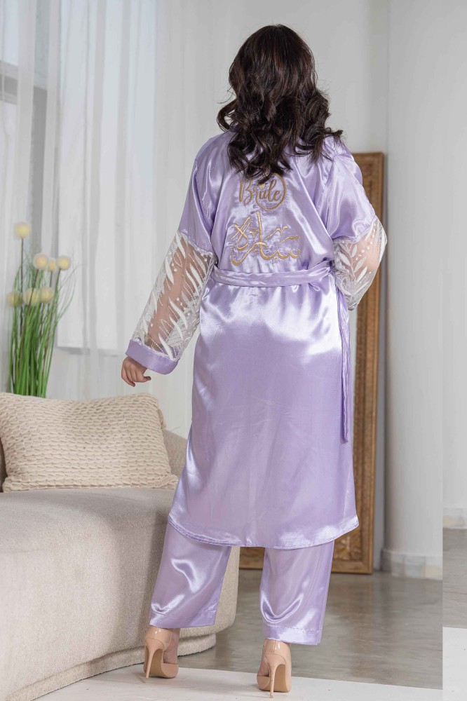 روب عرائس موف فاتح كرستال عبارة عن قطعة فاخرة وفريدة يتميز روب العرائس بقماشة الحرير الناعم الذي يضفي لمسة ولمعة من الأناقة على مظهر العروس يتميز الروب بقصة رائعة مع تدخيلات قماش التل من الأسفل والكم مع اضافة تطريز حسب الطلب يعطي الروب للعروس اطلالة رائعة وناعمة مما يجعل العروس تبدوا وكأنها ساحرة في يوم زفافه